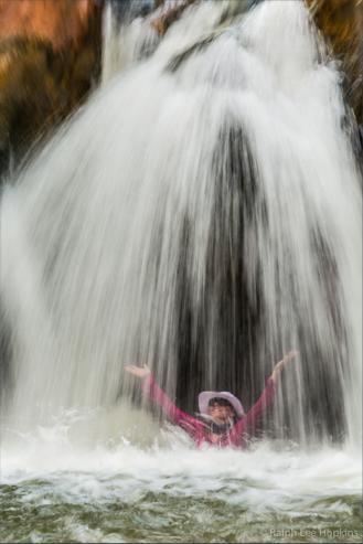 Hiker enjoys Waterfall, Stone Creek Canyon, Grand