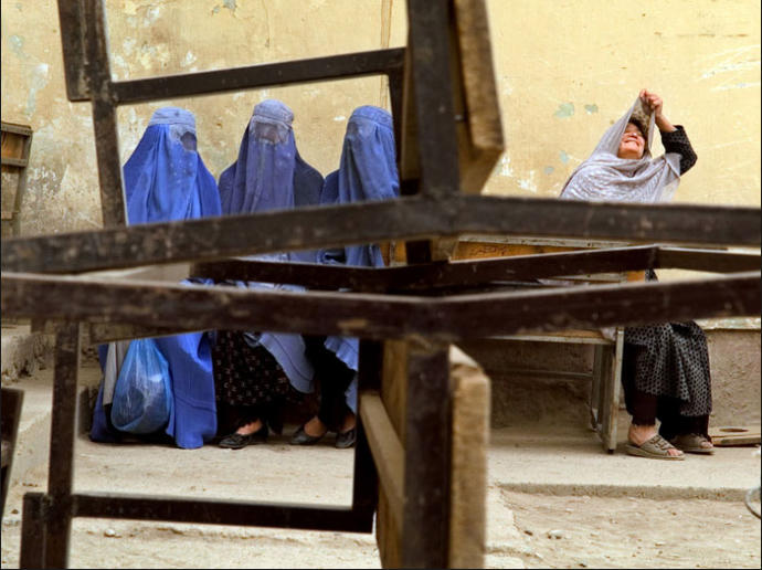 On the day of the first democratic elections in Afghanistan, women sit down to rest after voting at a polling station in