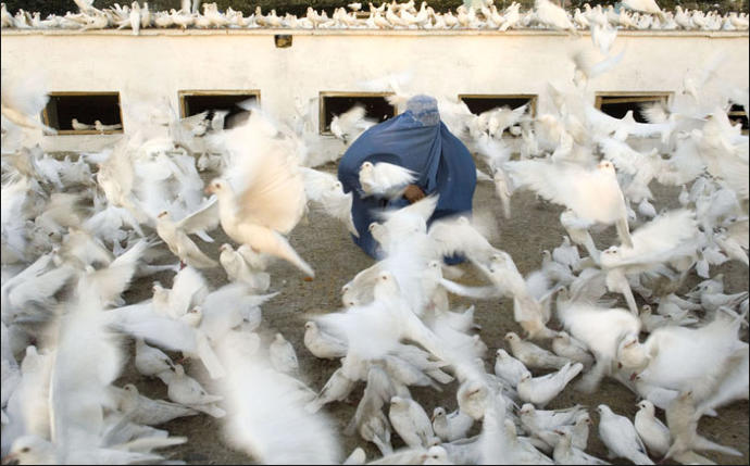 A woman feeds pigeons at the Blue Shrine in Mazar-e-Sharif. Afghans believe the the shrine’s pigeons are holy and so
