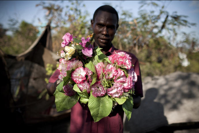 Thomas makes a living by collecting and re-making plastic flower bunches. He sells them to other residents of Kibarani