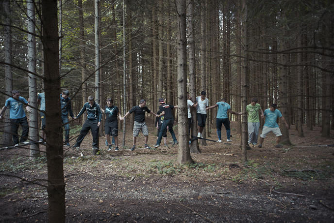 Axel, 17, being lifted through the spider web, an adventure based learning game. Each of the 19 teenagers from the