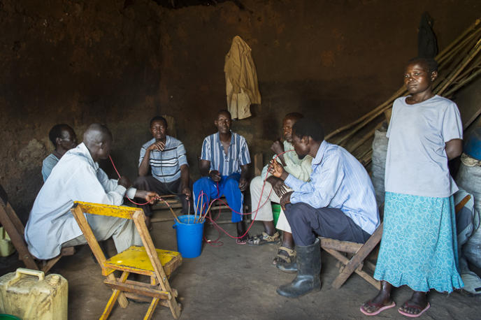 Drinkers enjoy a central pot of home-made alcohol in an illegal kafunda.