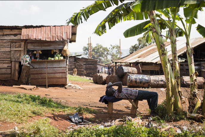 A drinker nurses his hangover in the shade of a banana tree. Imelda, a local distiller reveals 'the men around Kimasa