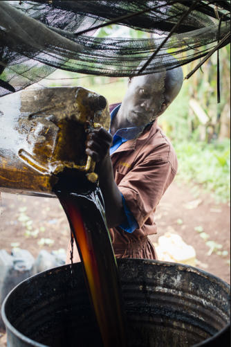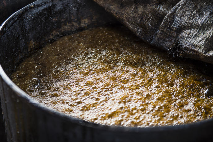 Having been left to ferment for 4 to 5 days, the sticky liquid is ready to be distilled.