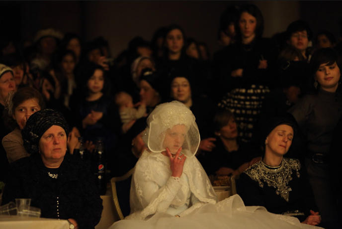 A bride waiting for the moment when an ultra-Orthodox Rabbi dances with her at her wedding. The bride is covered to