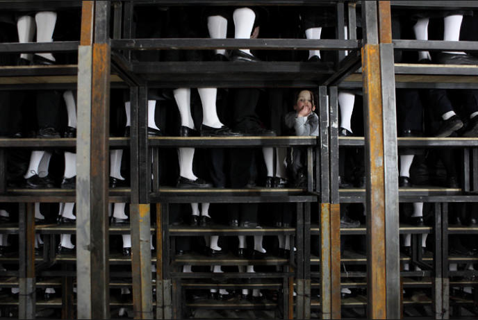 Ultra-Orthodox boy looks through people's legs at a Satmar wedding.
