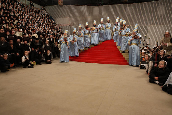 Hasidic Jews perform a show during the wedding of the daughter of their master Rebbe (teacher or mentor).