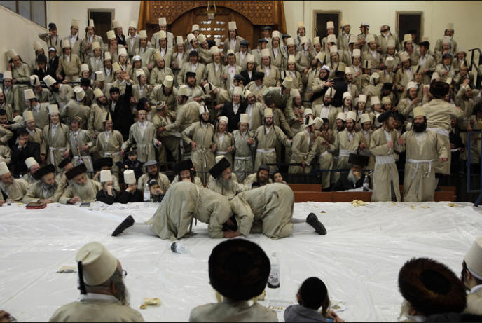 Hasidic Jews dancing at a celebration called 'Tish' during the Jewish holiday Purim.