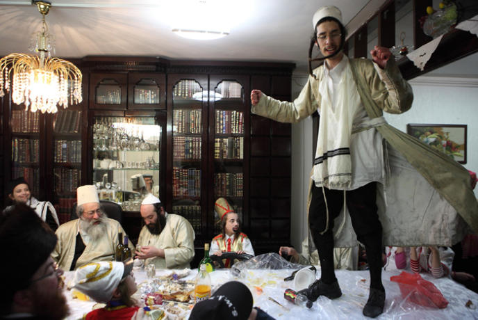 Hasidic Jew dancing on a table called at a celebration called 'Tish' during the Jewish holiday Purim.
