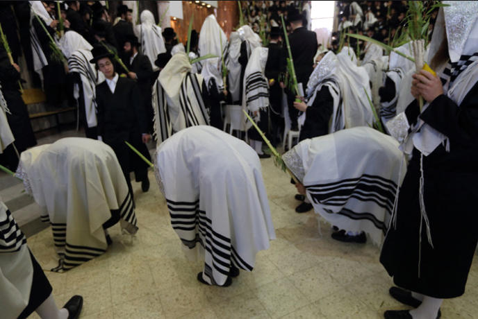 Hasidic Jews praying during the Jewish holiday of Sukkot.