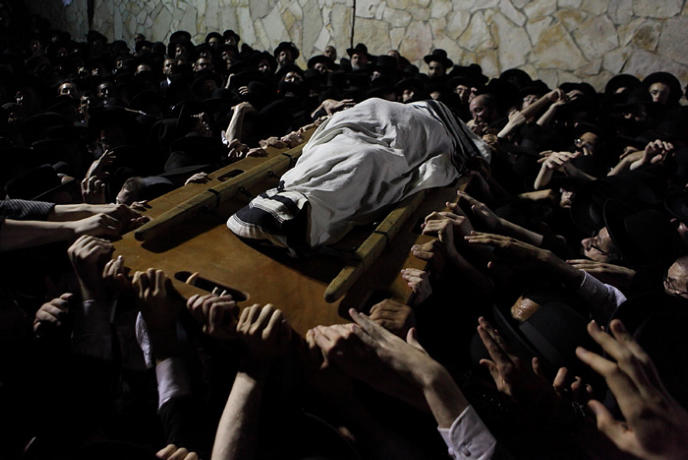 Orthodox Jews dancing at a demonstration in Jerusalem against the government's intention to force the Israeli army to