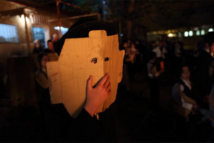Orthodox boy watching Lag B'Omer bonfire using a piece of cardboard box to protect him from the heat of the fire.