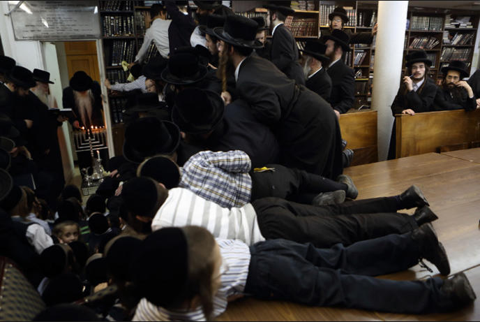Hasidic Jews watching their Rabbi lighting Hanukkah candles.