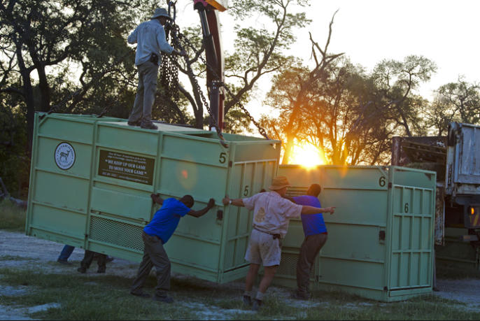 Cranes loaded the rhino crates onto trucks and they begun their journey by road into a remote area in Botswana. The