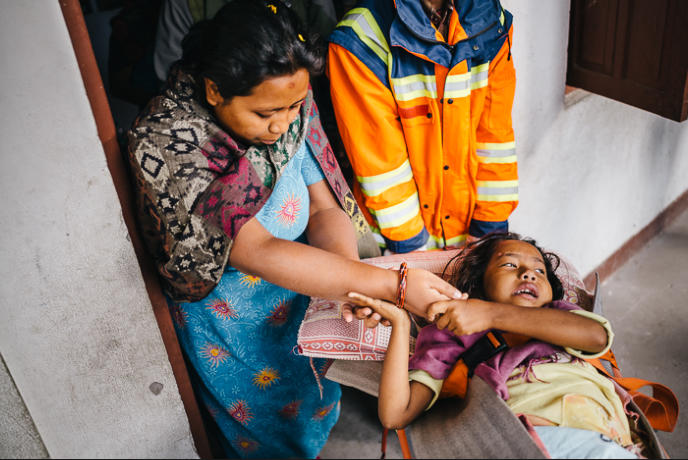 Lubina Lama, aged 7, holds her grandmother's hand inside an ambulance on the way to an emergency field hospital