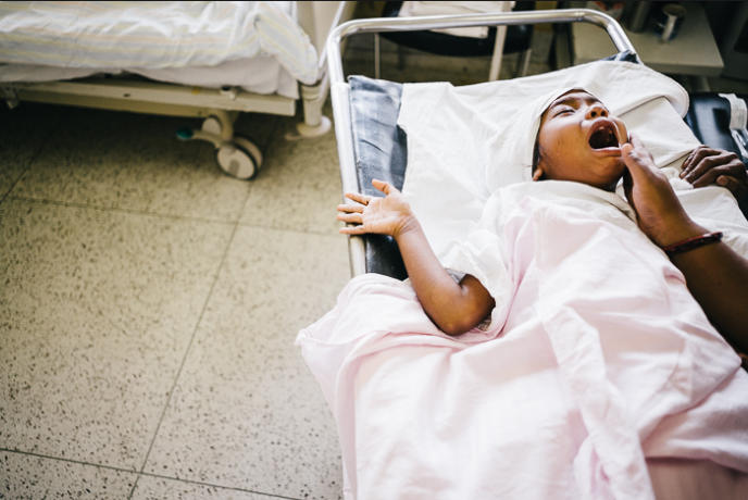 Lubina Lama, aged 7, cries in pain before treatment at a hospital. Lubina sustained injuries to her hips and legs during