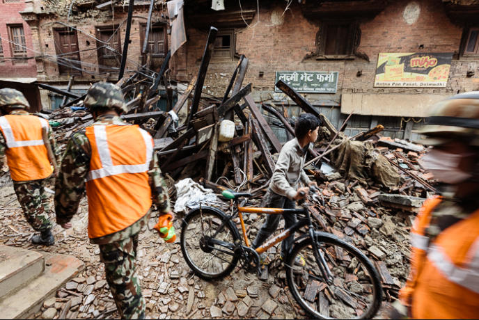 A boy pushes a bicycle past the rubble of fallen buildings as soldiers from the Nepalese army walk through the heavily