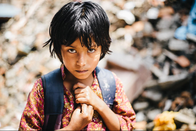 Seven year-old Rabina stands beside the rubble from buildings destroyed and damaged by the earthquake.