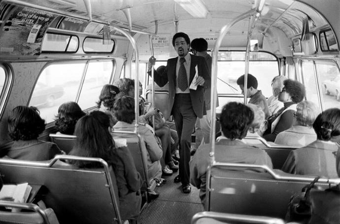 1973 - Oakland, California, USA: Black Panther Chairman Bobby Seale campaigns for Mayor of Oakland on a city bus.
