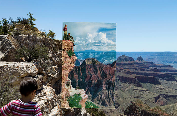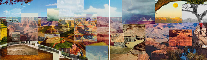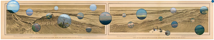 images are inserted within the contemporary photograph, creating sweeping panoramas that convey the big picture