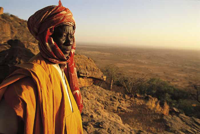 A Dogon elder from the cliffs of the Bandiagara escarpment in Mali peers toward the lands of the Fulani, one of the many