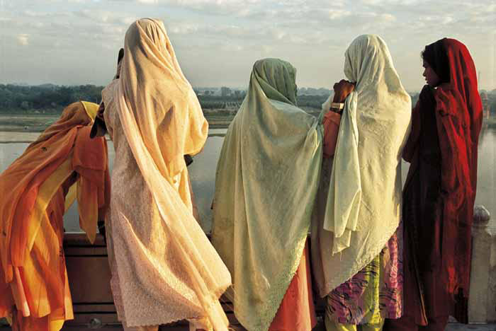 On the south terrace of the Taj Mahal a group of young women in colourful saris gaze over the great bend of the Yamuna
