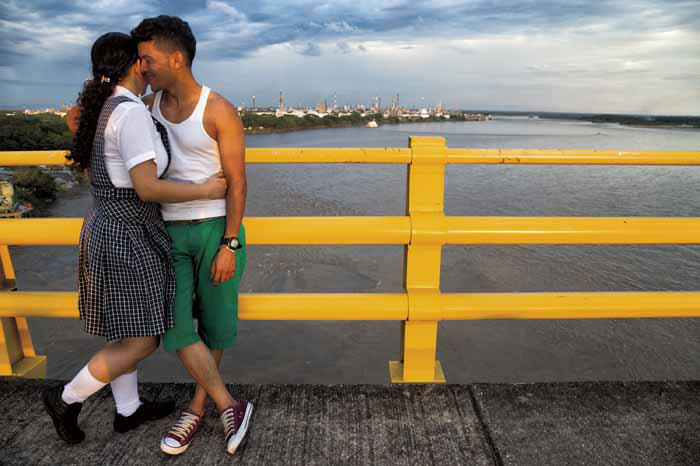 Young lovers at sunset on a bridge over the Río Magdalena, with Barrancabermeja, the oil capital of Colombia, behind