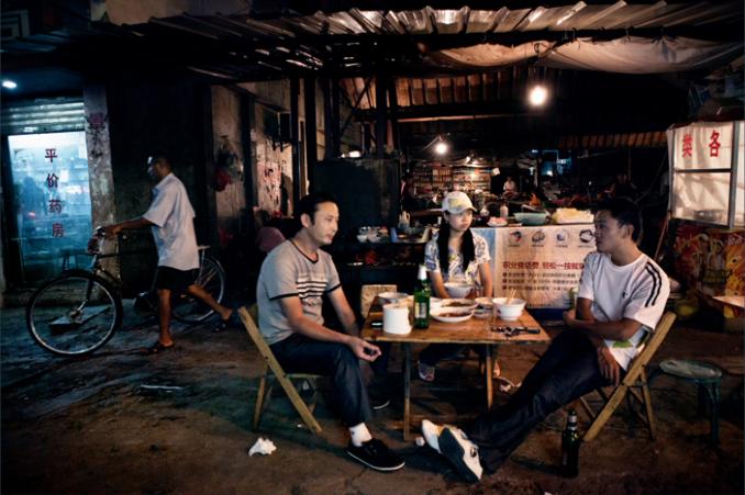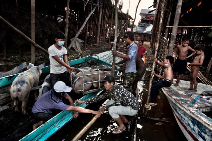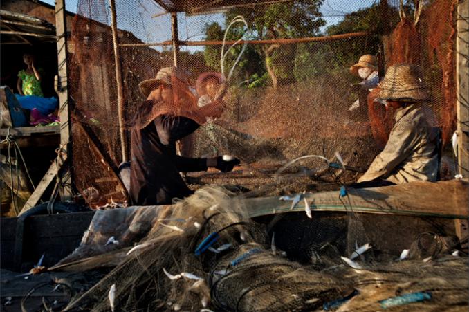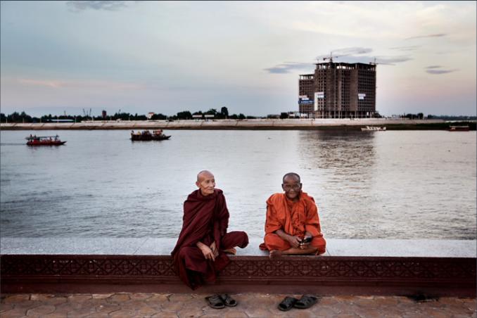Monks sitting where the Tonle Sap and Mekong rivers meet, Phnom Penh, Cambodia.