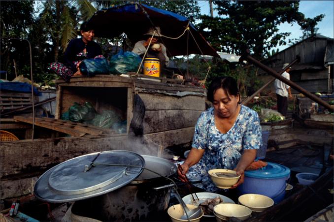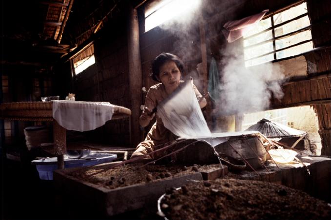 A woman making rice paper in the Mekong Delta, Vietnam.