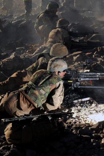 Members of Lima Company (L COY) Fire Support Group (FSG) supressing enemy targets while the main group of