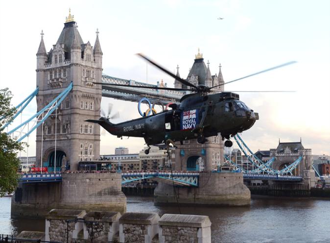 The Olympic Flame was delivered to the Tower of London by two Royal Navy Sea King Mk 4 helicopters from the