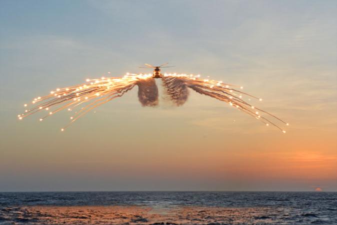 As the sun goes down over the Indian Ocean, HMS Northumberland’s Merlin sends more than 100 flares cascading