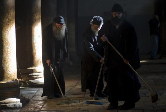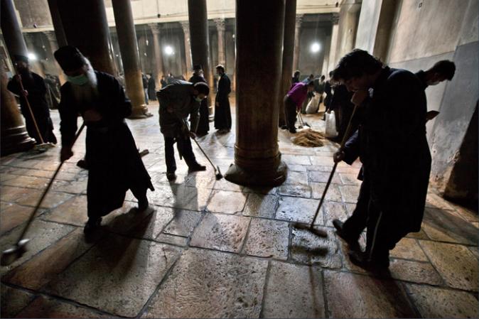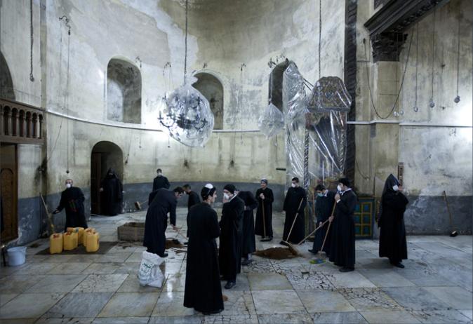 Armenian Orthodox clergy with their brooms, piles of dirty saw dust, and Jerry cans of kerosene (L) as they clean
