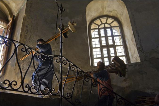 Orthodox Christian clergy sweep up saw dust as they clean the double column aisle to the side of the main nave in