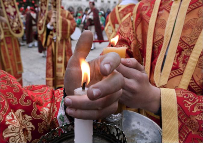Greek Orthodox choirboys trying to keep their candles from going out as they wait in a windy, cold Manger Square,