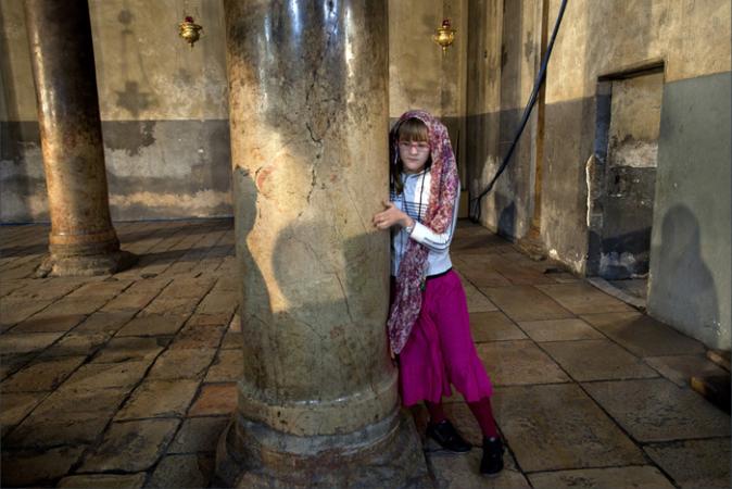 A young Russian Orthodox Christian girl hugs a large marble column in the central nave of the Church of the