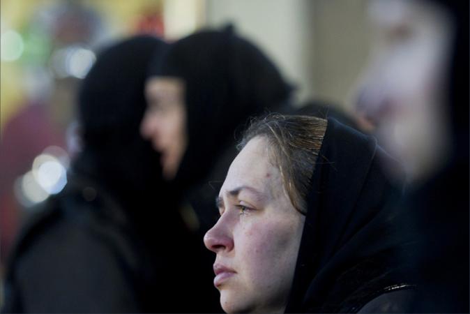A Greek Orthodox woman with tears in her eyes as she waits with several nuns nearby for a service on the