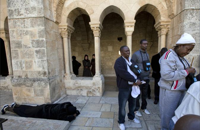 Palestinian women watching a Christian man from Nigeria as he prostrates himself on the stone floor of a patio in