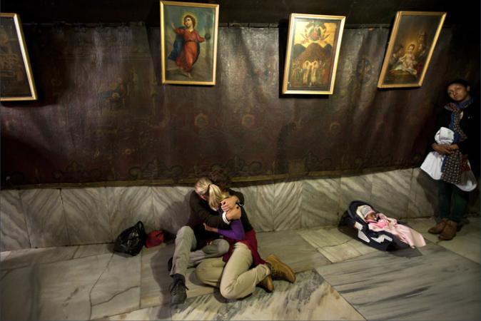 A couple embrace while crying as they pray on the floor of the 'Grotto' in the Church of the Nativity, 17 December
