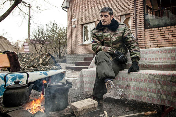 ‘Krest’, one of the commanders of the Vostok Battalion, at a gas station destroyed during the conflict with Ukrainian