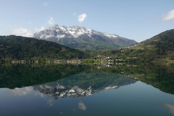 The mountains mirror in Lago di Caldonazzo. Val Sugana.