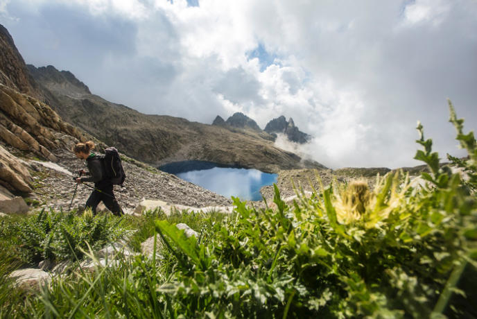 Basti climbs with a 25kg back pack towards Cima d'Asta with Lago Cima d'Asta in the background.