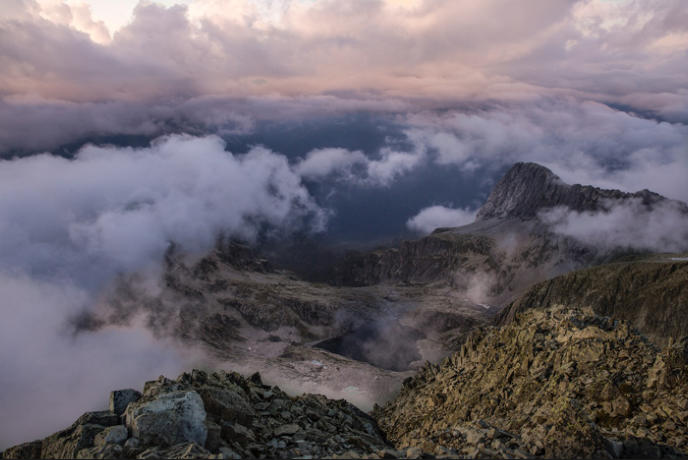 The Dolomites: rugged mountain faces, shaded summits, dark walls. And