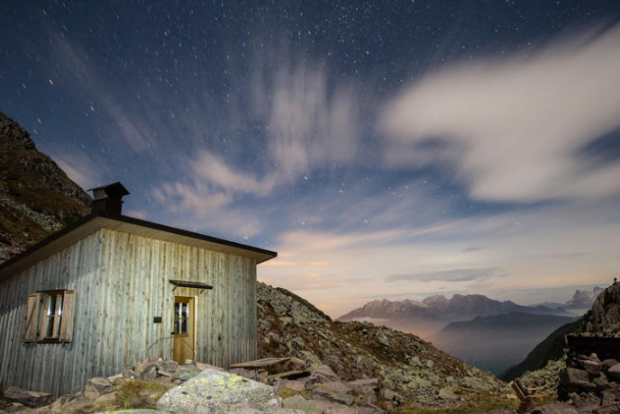 I light the Bivacco Paolo e Nicola with my torch during a long exposure at Forcella Valmagiore in the Lagorai.