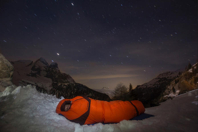 Basti sleeping outside at the foot of Marmolata in -10 degrees C.
