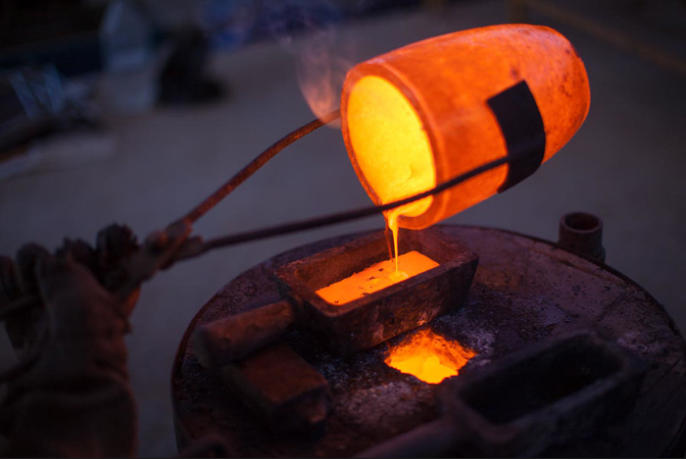 An ingot of Fairtrade-certified gold and silver is poured at the SOTRAMI foundry.