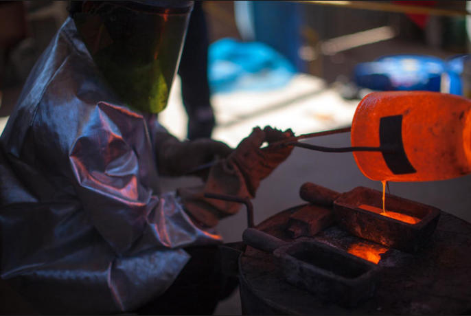 An ingot of Fairtrade-certified gold and silver is poured at the SOTRAMI foundry near Santa Filomena, Ayacucho,