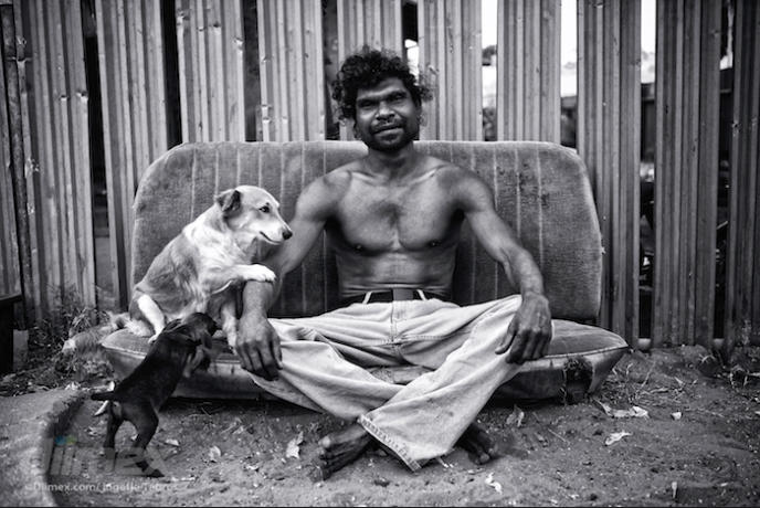 with his beloved dog Dontee and her pup Little Blacky. Broome, Western Australia.