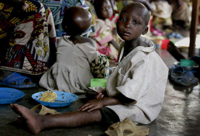 A young boy, who is suffering from malnutrition, eats a high nutrition porridge, at Matumaini therapeutic feeding centre,