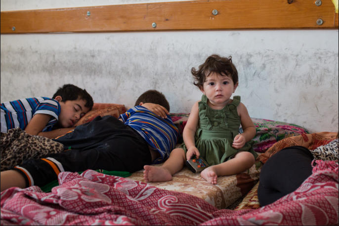 Enjey, 1, sits beside her brothers and sisters after sleeping in a classroom of UN run school in Gaza city, Gaza. The